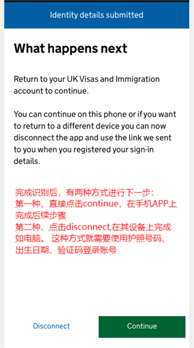 身份验证时通过手机APP UK Immigration:ID Check. 此时需要扫描你的护照首页,把手机放在首页,通过NFC识别护照信息,进行面部扫描(建议在灯光充足的房间,面部光源均匀,手机距离面部20厘米,此照片将会在eVisa上)。