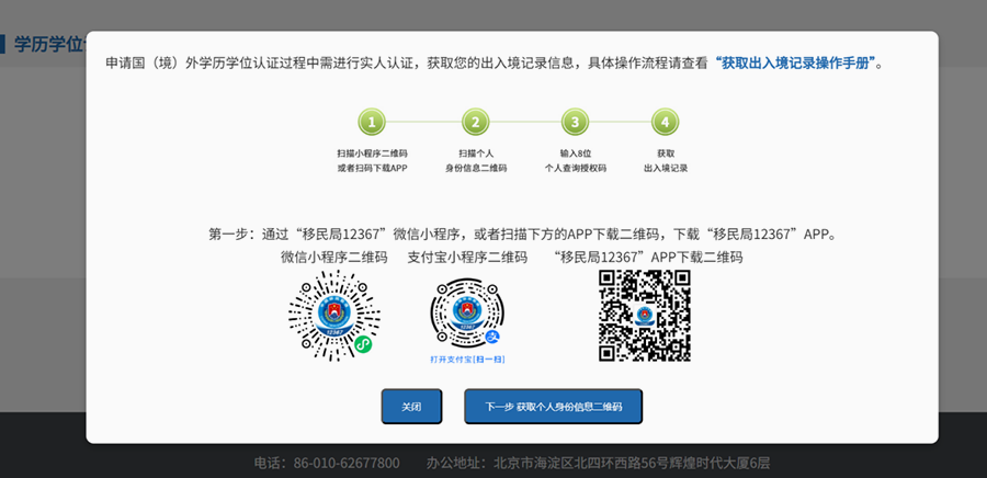 按提示先下载安装“移民局12367”手机APP,然后使用该APP扫描页面二维码,授权获取出入境记录。