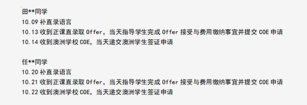 签证递交后,为了最大程度提升签证获批速度,签证老师进行了多项催签工作。例如,将澳洲学校关于最晚报道和注册要求的信息整理成多封催签信补交移民局;多次定期电话联系移民局催签,让operator备注学生入学时间及对应学制信息;提前向学生发送澳洲行前准备的指导邮件,让学生同步准备等等。