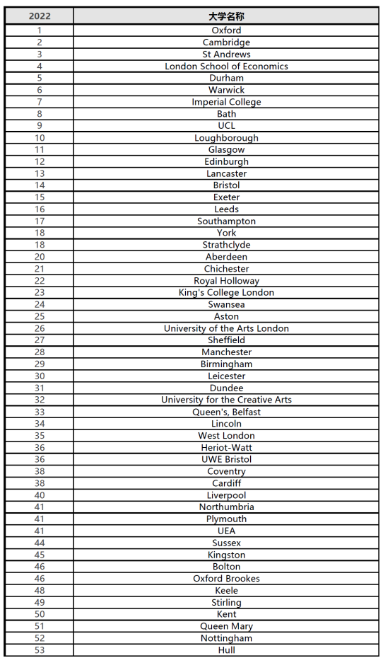 Top 5大学不变,只是排名稍微发生了变化,榜首依旧是牛津大学,剑桥大学超过圣安德鲁斯大学重回第2,伦敦政治经济学院超过杜伦大学位居第4。其中圣安德鲁斯大学和杜伦大学在2022年QS世界大学排名里位于91,82位。