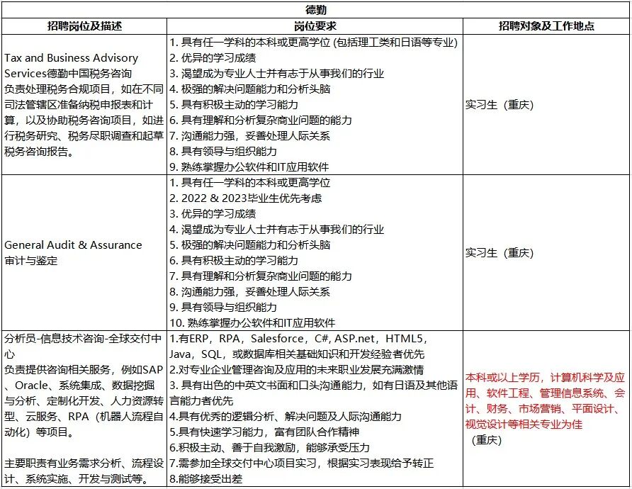 具体招聘信息可以在德勤招聘公众号以及官网查看