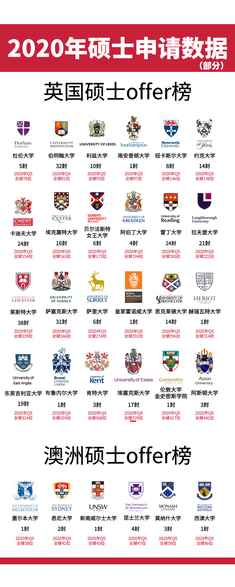 除了以上同学以外,蔚蓝菌统计了2020年申请入学英国以及澳洲硕士课程的所有数据,截止到目前我们已经成功获得超过300份来自各个大学的录取信!