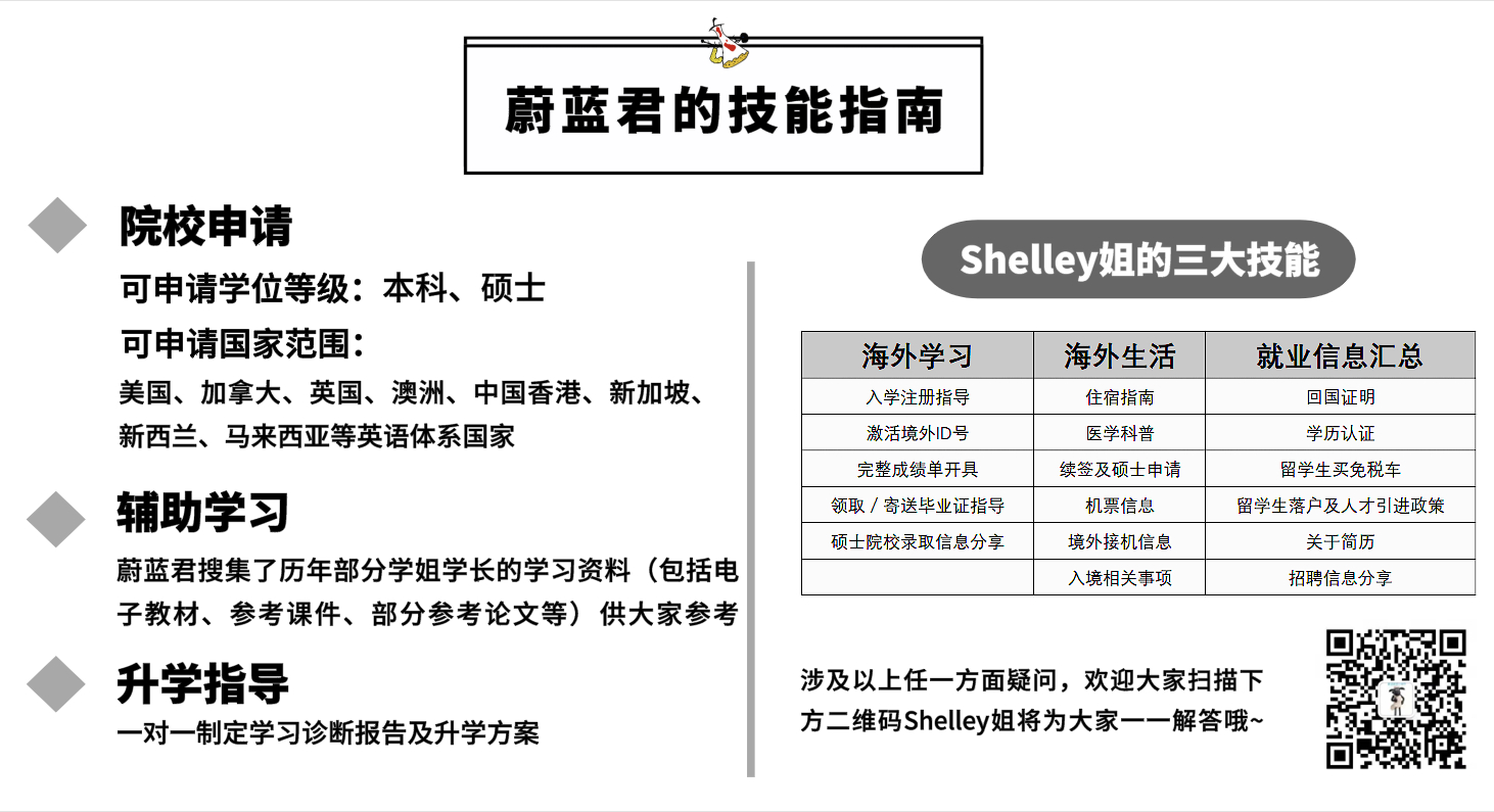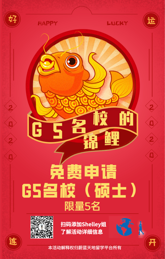 国内同学按照Shelley姐要求将上述海报发送至个人朋友圈(设置所有人可见),请求好友点赞数达100个。截屏发给Shelley,Shelley评估合格后,可获得免费申请英国G5名校的资格。国外的本科同学可将现有成绩单发给Shelley,Shelley评估合格后,可获得免费申请英国G5名校的资格。祝大家在2020年里申请到的学校都能下offer!