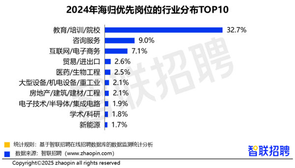 2024年对留学生需求最大的岗非教培岗莫属了,职位数占比达到32.7%;其次是咨询服务行业,占比9%;排名第三的是互联网/电子商务行业,占比7.1%。