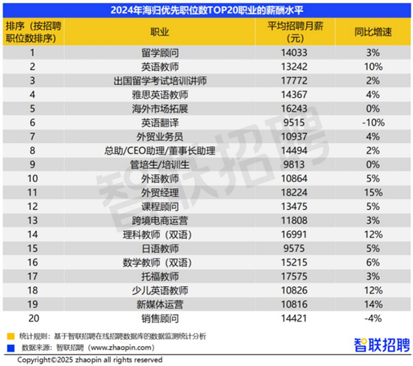 数据显示,2024年海归优先岗位的平均招聘薪酬已经连续六年走高,从2019年的11,739 元/月增至2024年的15,440元/月。