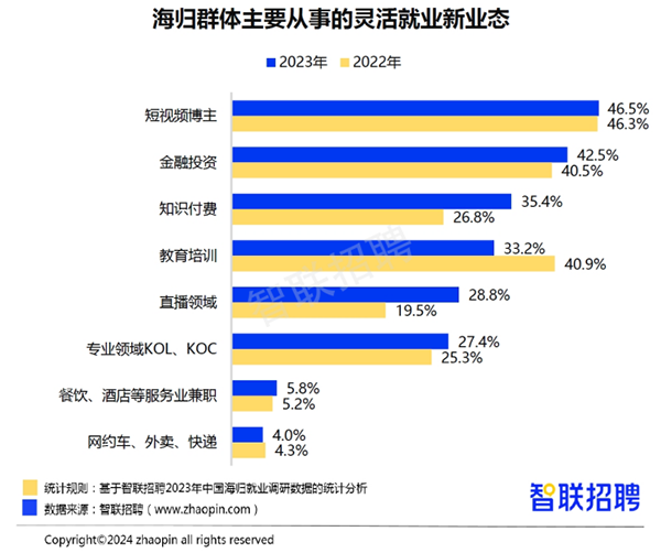 不仅如此,海归的就业选择也越发多元,数据显示超7成海归愿意尝试灵活就业,其中选择最多的就是短视频博主,在2024年占比达到46.5%,连续三年位居海归灵活就业的榜首。