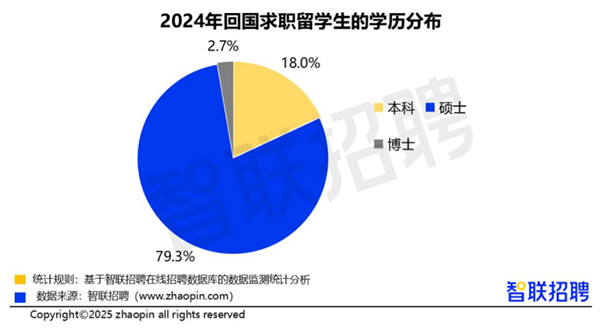 从智联招聘的数据上可以看出,留学生在学历上具有明显的优势,79.3%的海归具有硕士学位,2.7%有博士学位。