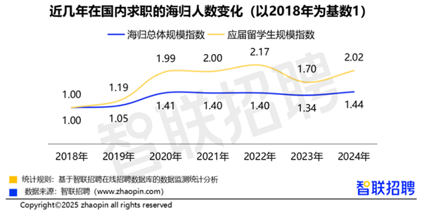 在2024年归国就业的留学生人数迎来爆发式增长,同比增长20%,达到2018年归国就业人数的2倍。