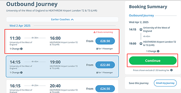 ③进入这一步后页面将会列出同学们所选出行日期的所有可用车次,同学们根据自己的安排选择即可,直接点击想选的车次然后点击右边的continue进入下一步。如在这一步发现选择的日期或者目的地有误,可以点击页面最上方的edit journey修改。