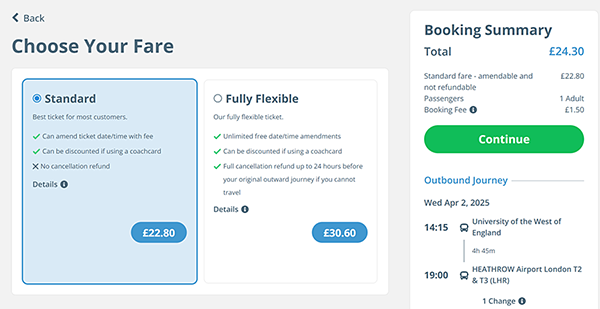 ④确认车次后就需要确认支付信息,在这一步同学们可以选择standard ticket或者fully flexible ticket。两者的区别是standard ticket可以付费改签且取消不退款,而fully flexible ticket可以免费改签且24小时前取消可以退款,因此fully flexible ticket会比standard ticket贵一些。