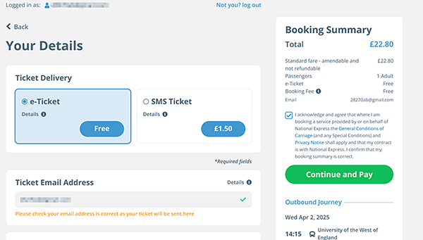 ⑦完成支付后同学们就可以前往邮箱查看具体的票据信息啦,后续乘车携带护照等个人证件前往线下站点乘车即可。如果不清楚具体站点的位置可以前往national express官网查询站点位置。https://routemap.nationalexpress.com