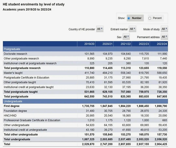 根据数据显示,2023/24学年英国高等教育入学总人数为2,904,425人,较上一学年的2,937,155人减少了1%。