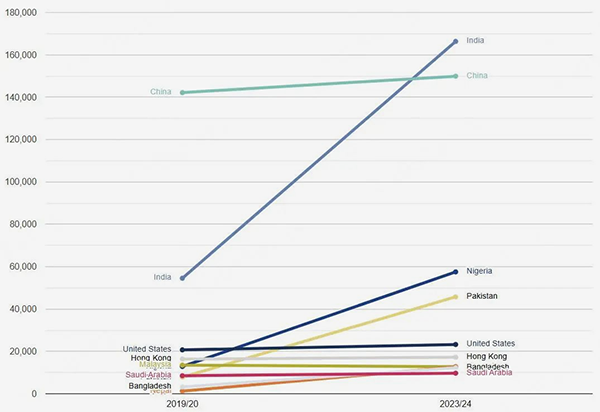 来自印度的留学生仍是最多的,共166,310人;中国内地的留学生数量为149,885人,排在第二位;留学生生源国/地区3-5位分别是尼日利亚(57,505人)、巴基斯坦(45,720人)、美国(23,250人)。