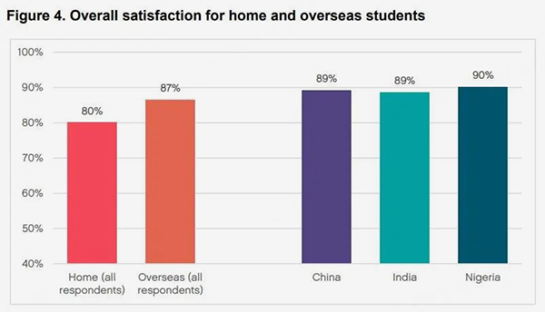 英国授课型硕士也有很好的就读体验。英国高等教育促进会(Advance HE)发布的《Postgraduate Taught Experience Survey 2024》显示,留学生对授课型硕士满意度为87%,中国留学生满意度更是高于平均值,达到89%。