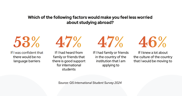 而能缓解留学焦虑的因素中,53%的中国学生表示,如果确认不会遇到语言问题,将更愿意出国;47%表示,若有朋友或家人在当地,并听说该校对国际生支持良好,会感到安心。