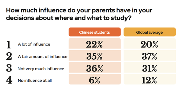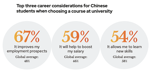 “毕业生就业力”成为中国学生选校时的关键指标 —— 65%的受访者表示将这一情况纳入重点考虑,高于全球学生平均水平13个百分点。