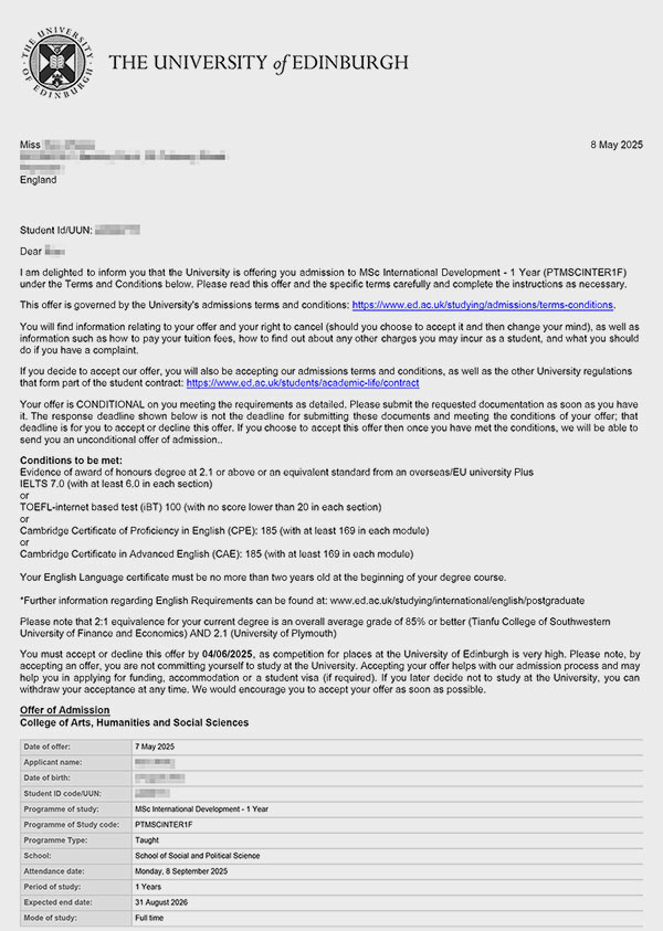 这些已具备的背景优势,与国际发展领域对贫困地区经济振兴、资源分配优化的研究需求高度契合,通过硕士该专业的学习,可以进一步探究金融工具如何能够助力社会经济发展、减轻贫困,并推动可持续性发展。同时,“3+1” 双本科经历赋予的跨文化适应能力和国际视野,也正是国际发展专业看重的素养。基于此,我们将爱丁堡大学作为冲刺目标,并制定了以 “金融