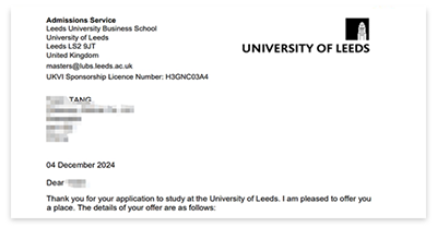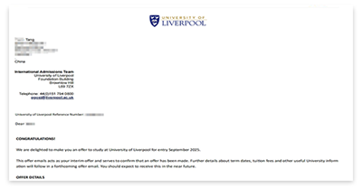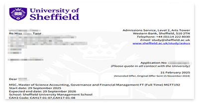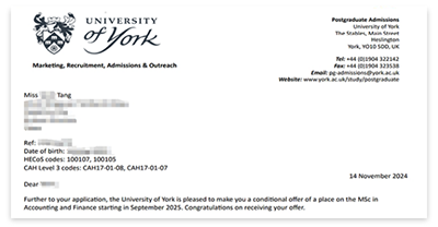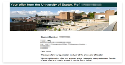 经过一年的PQP课程学习,唐同学最终不仅顺利取得了英国本科学位认证,还在申请季中脱颖而出,收获了英国多所知名高校的硕士录取通知书,包括: