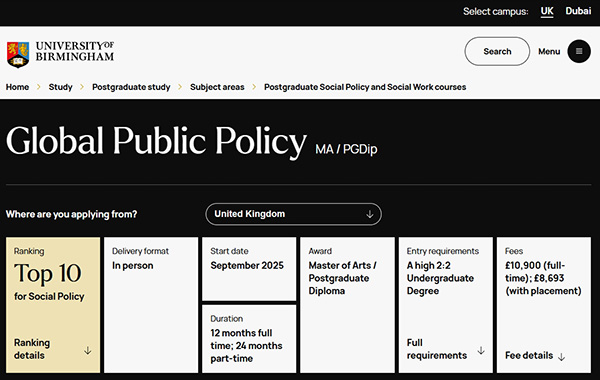 具体可参看:https://www.birmingham.ac.uk/study/postgraduate/subjects/social-policy-and-social-work-courses/mapgdip-global-public-policy