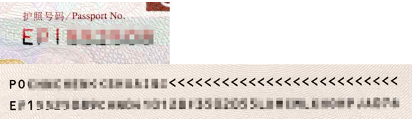 3. 护照号码中常见的字母“I”和数字“1”易混淆,请参看护照首页最后机读区进行辨别,即护照首页下方的两行数字、英文字母、符号组合的代码,示例如下: