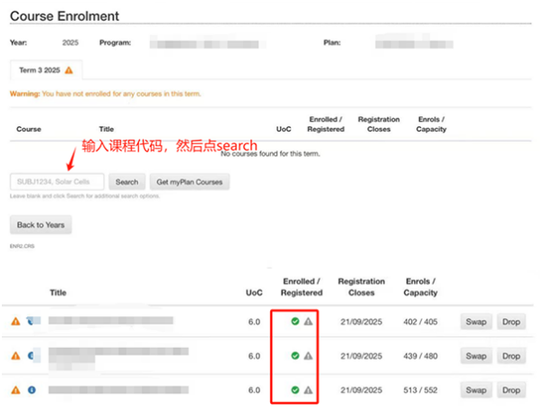 5. 正式进入选课页面后,同学们只需要在下方输入心仪的课程的代码搜索添加即可。注意只有当”Enrolled/Registered”处出现绿√才算选上课程了。每学期在不申请Overload的情况下最多只能选择3门课程,最少需要选择2门课程。申请Overload的话,最多可以选4门。