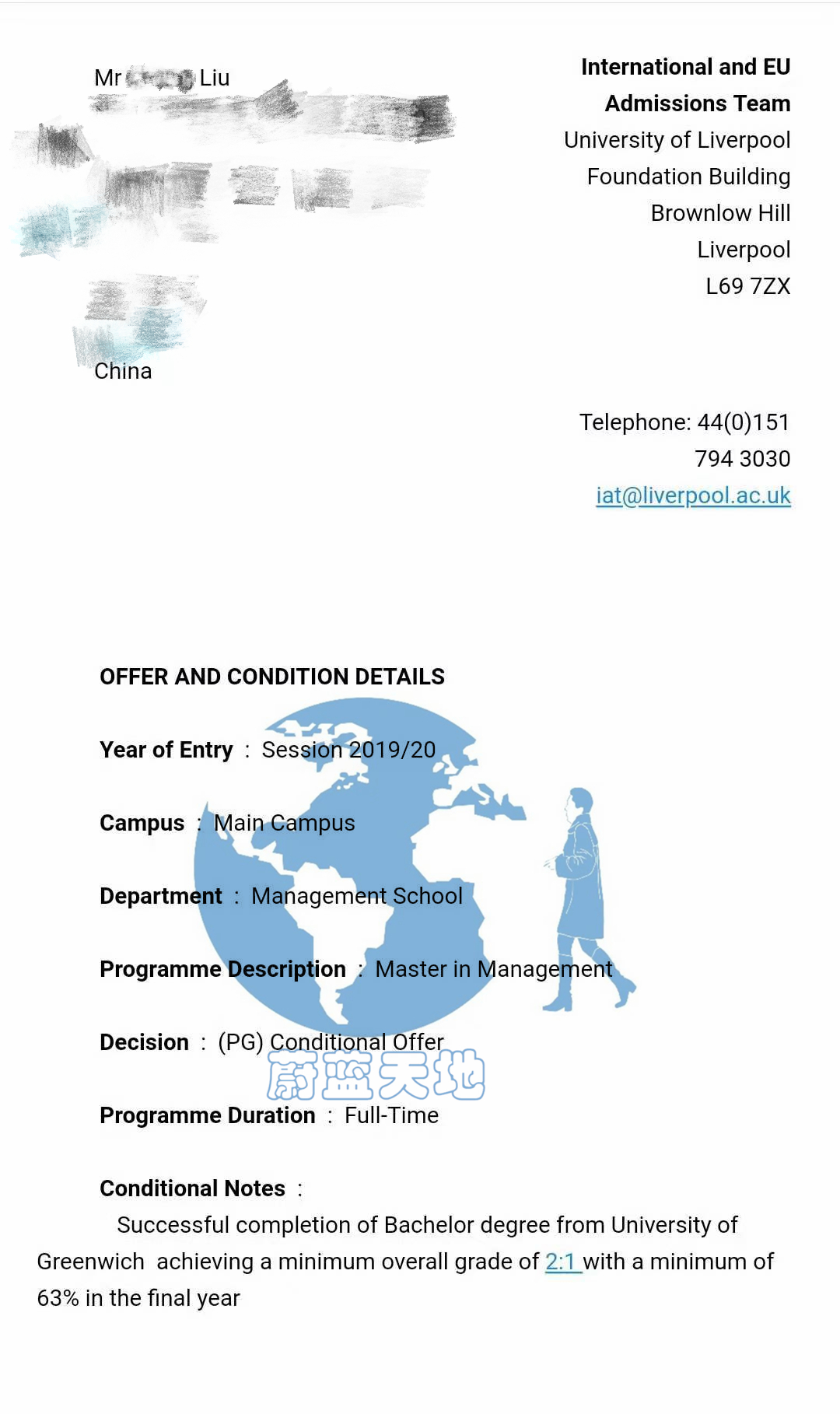 从以上案例可以看出这两位同学与同期的其他同学相比,他们的国内成绩在申请中并不是特别占优势,但是他们通过国外大学本科一年地不断深度学习,最终在英国本科毕业时斩获得1等学位这个好成绩,同时也在蔚蓝老师的申请帮助中,被利物浦大学录取,并且符合利物浦大学最终入读条件!
