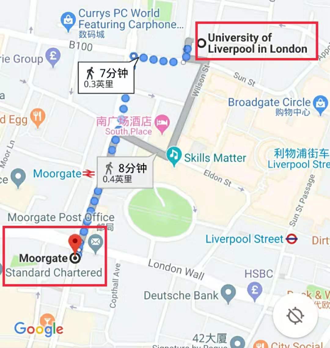 利物浦大学伦敦校区的交通也十分便利,从Liverpool Street地铁站出发,走大概十分钟就可以到学校。另外一条路线,从校区到Moorgate(也是附近的地铁站)也就不到十分钟的路程。