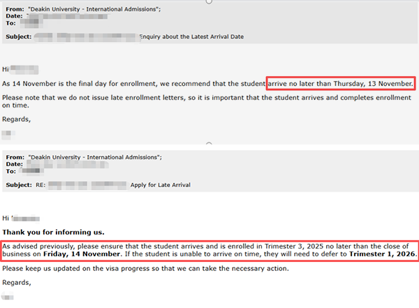今年,我们有两位前往澳洲迪肯大学就读海外本科的同学希望入读2025年11月的正课。然而,由于澳洲签证的不确定性以及两位同学还需要考取直录语言所花费的时间,2位同学面临延期至次年3月入学(此时段入学将会增加半年学制)的风险。