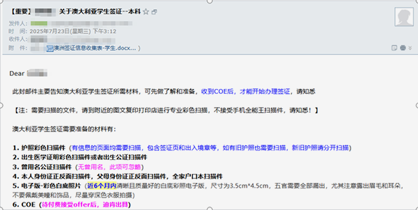 为了最大程度提升效率,签证老师早在6月就告知学生签证审理流程、审理时间预留、延迟入学风险等等。紧接着,7月就开始让学生准备好所有相关材料。例如,提前发送签证指导、准备体检等,所有相关事宜全部提前进行。在此过程中,我们的两位同学也非常配合,最终材料完整性和真实度都非常高,从初期就将“补件拖延”扼杀在摇篮中。