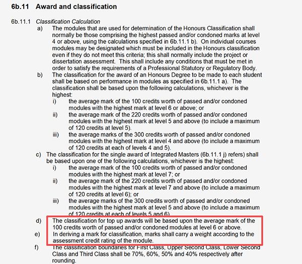 ①The classification for top up awards will be based upon the average mark of the 100 credits worth of passed and/or condoned modules at level 6 or above.