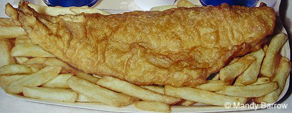4、炸鱼薯条:鱼(鳕鱼、黑线鳕鱼、胡桃、鲽鱼)用面粉用麦芽醋炸成面糊,这是英国传统外卖食品。