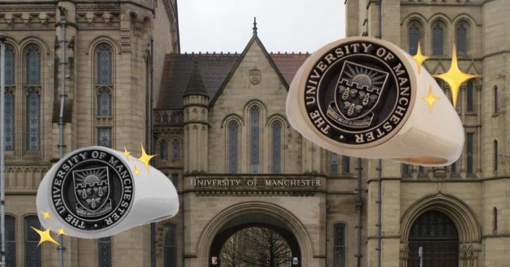 曼彻斯特大学的印章戒指有10种不同的图案,有四种不同的金属可供选择,可以选择增加侧板,上面写着毕业生的学位缩写和毕业年份,还可以选择在里面刻上互补的内部雕刻,以及定制一系列你想要的图案,包括黑铑或有一个字面上的钻石镶嵌。