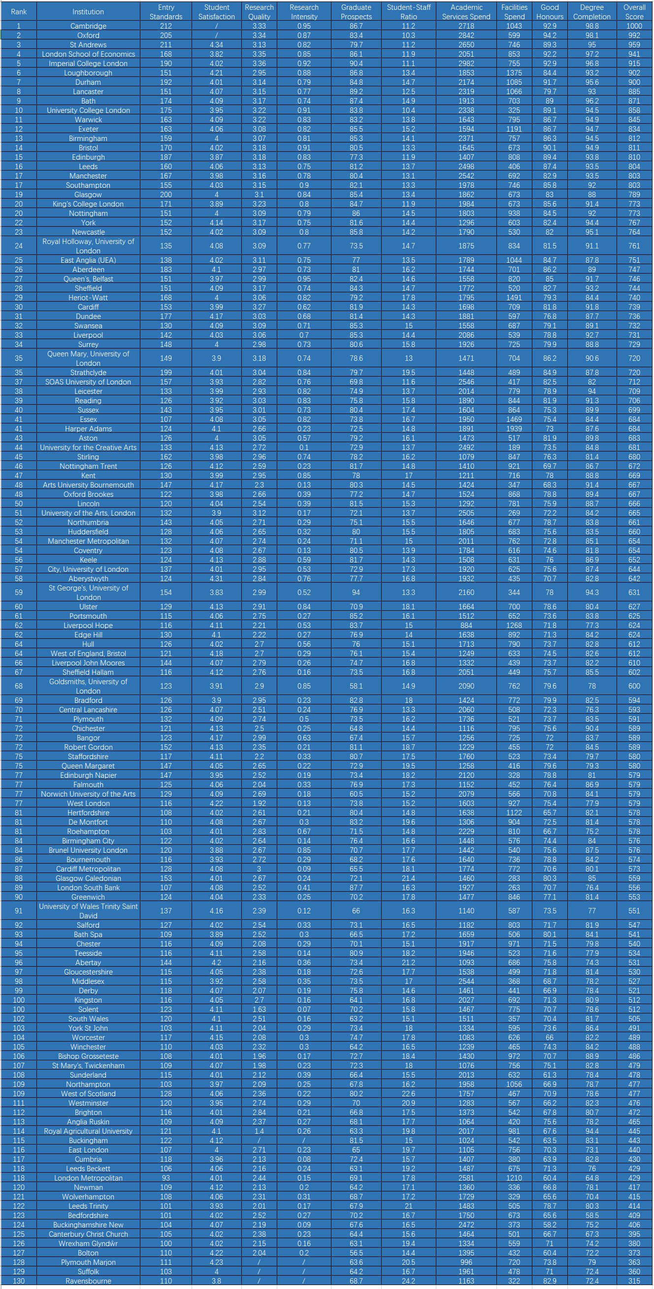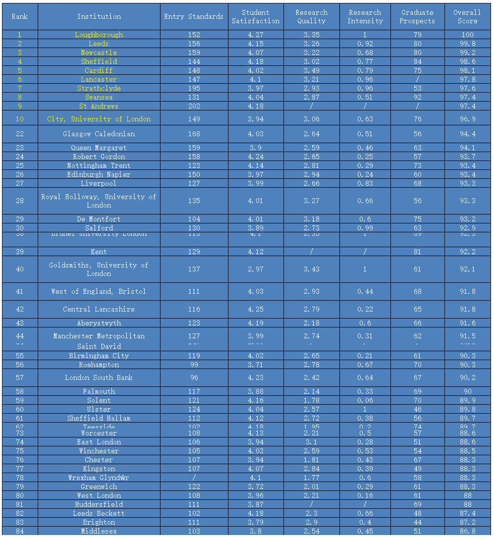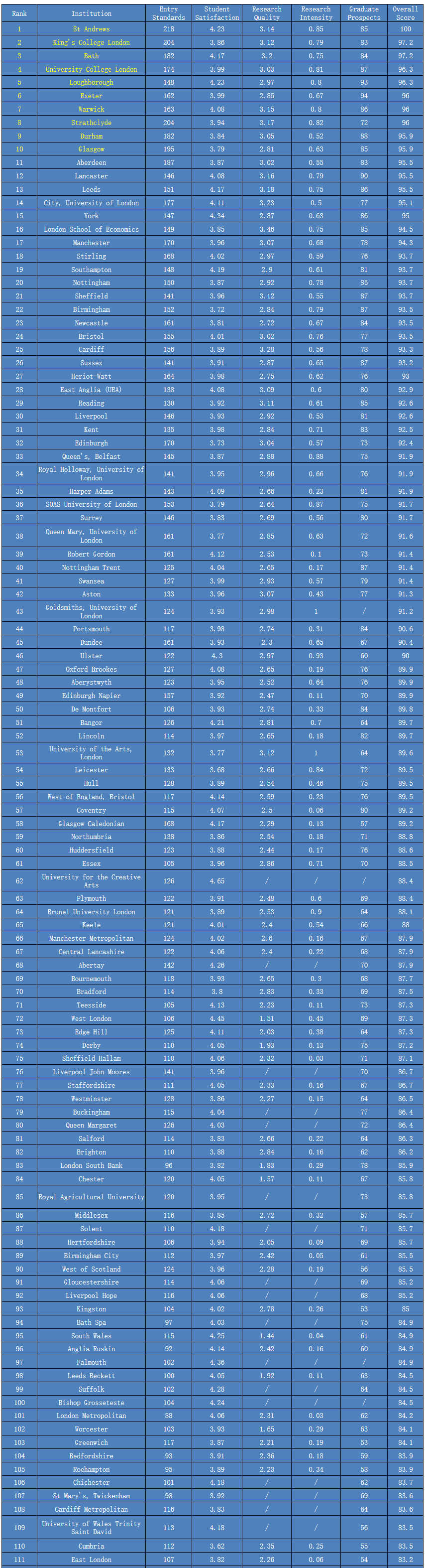 Top5大学没有变化,依次为剑桥、牛津、圣安德鲁斯、伦敦大学政治经济学院、帝国理工学院