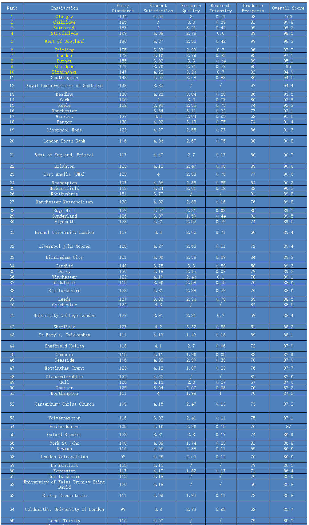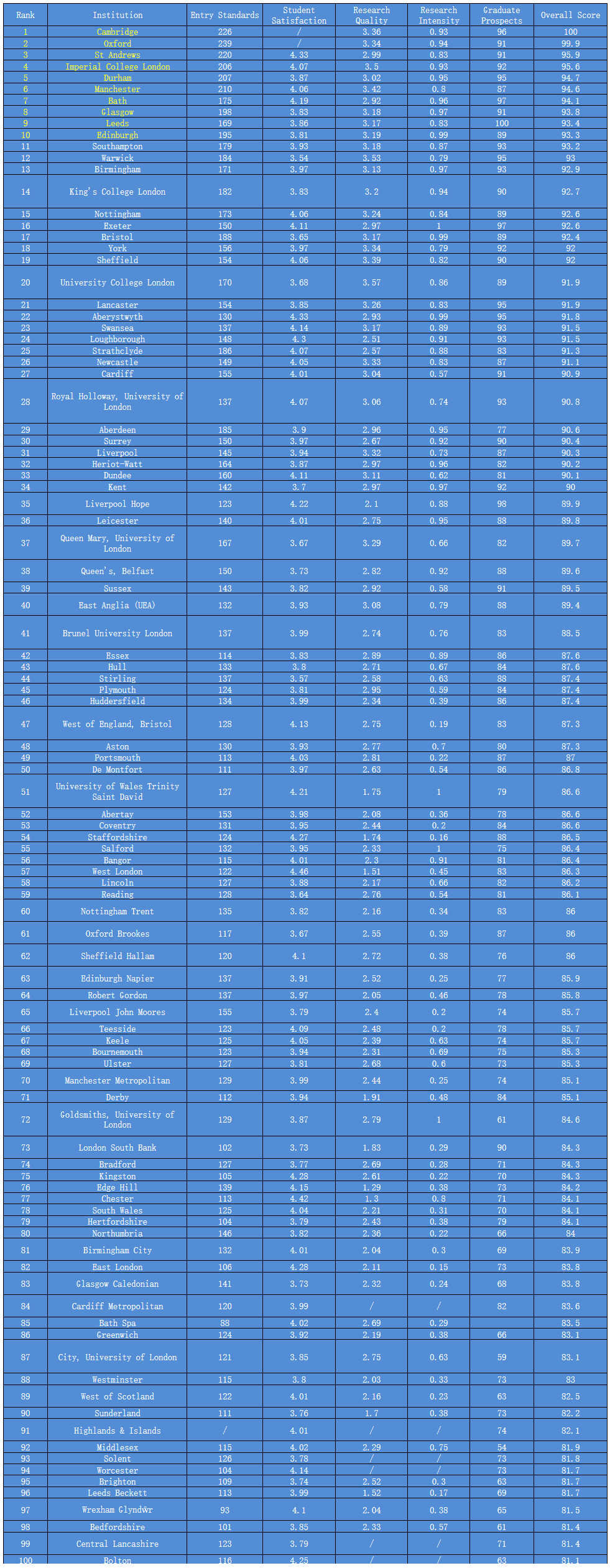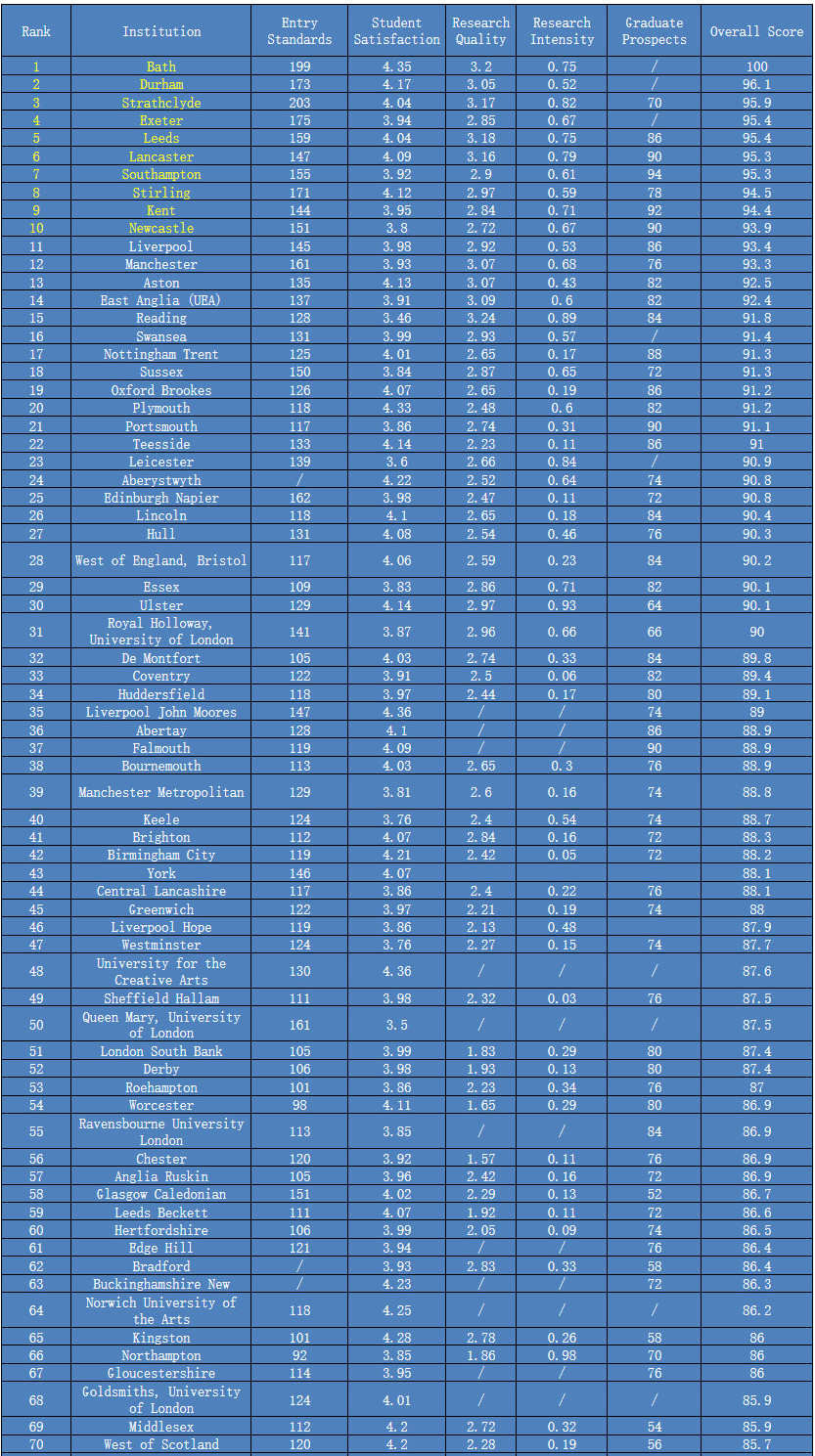 Top5大学没有变化,依次为剑桥、牛津、圣安德鲁斯、伦敦大学政治经济学院、帝国理工学院