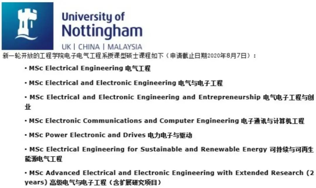 诺丁汉大学工程学院的下面几个专业,重开后截止日期延长至8月7日。