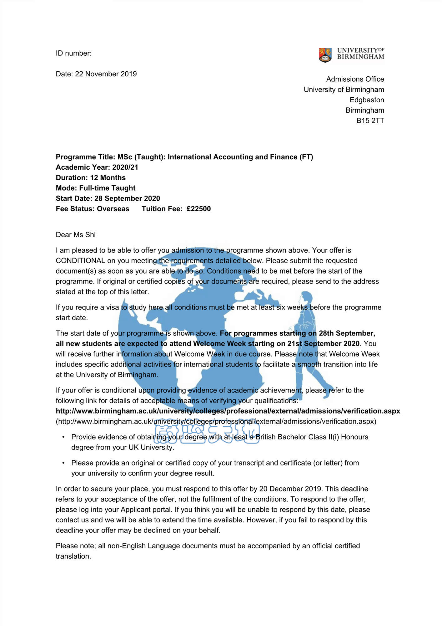 2019年伯明翰大学国际会计与金融硕士/2020年利兹大学会计与金融硕士专业录取offer展示: