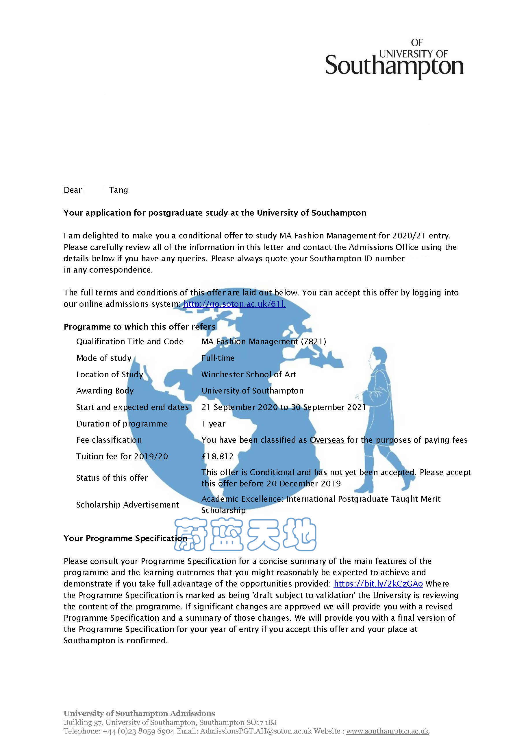 2019年南安普顿大学时尚管理硕士录取offer展示: