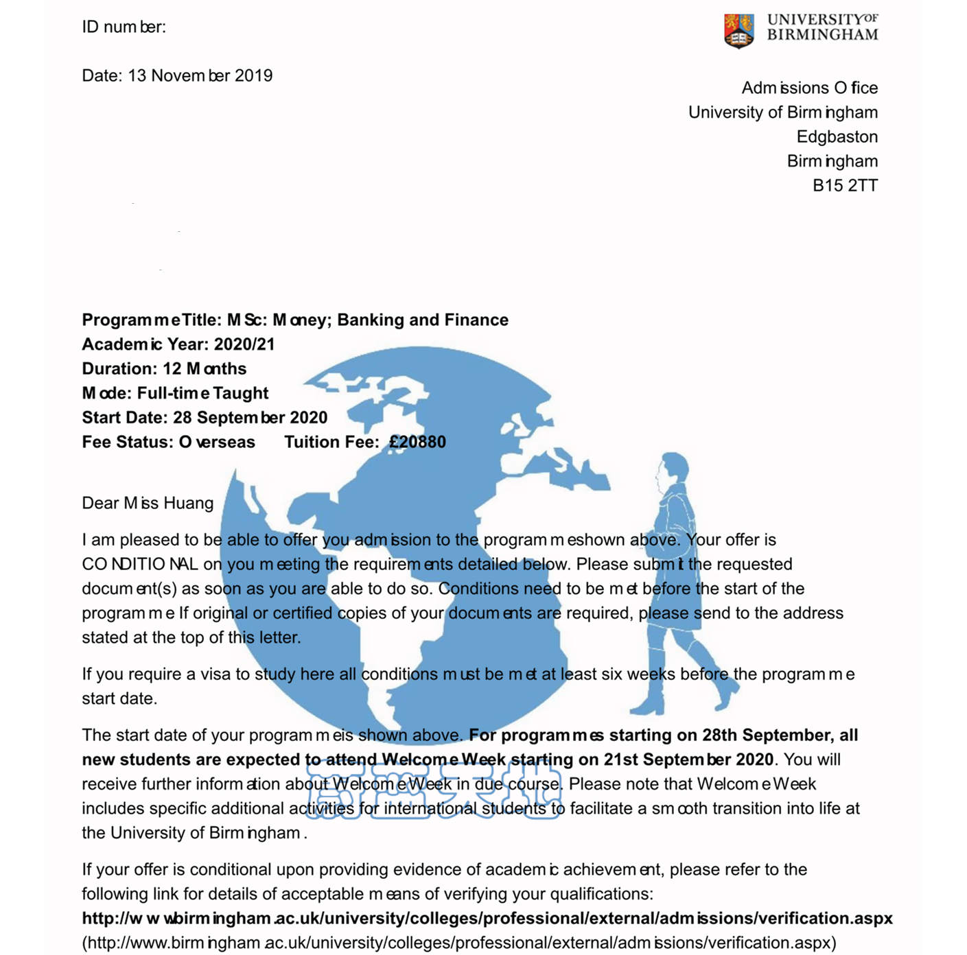 2019年伯明翰大学货币,银行和金融硕士录取offer展示: