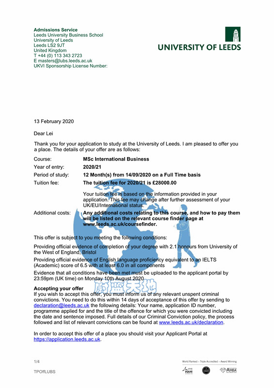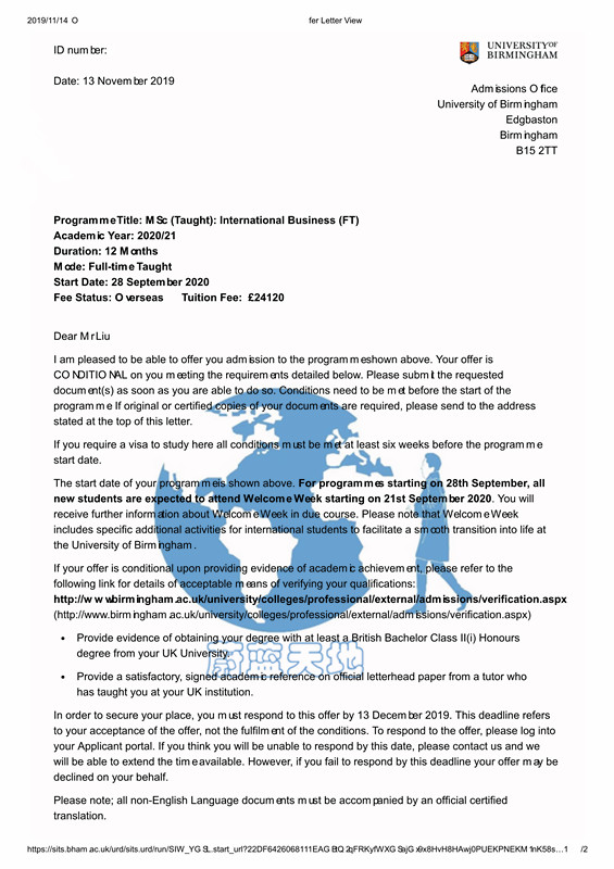 2019年/2020年伯明翰大学/利兹大学国际商务硕士录取offer展示: