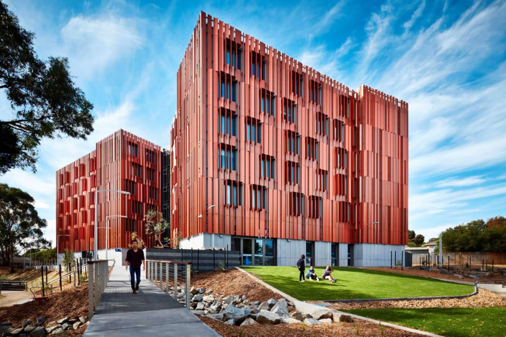 莫纳什大学教学楼建筑(砖砌作为设计意图的特征)位于校园最繁忙的人行道之一的相交处,仅高四层,与邻近的11层高的孟席斯现代主义建筑形成鲜明对比。大学学生宿舍gillies hall获得2019年墨尔本设计奖,其低能房屋设计是南半球最大的认证建筑,也是澳洲第一个符合这一标准的学生宿舍。