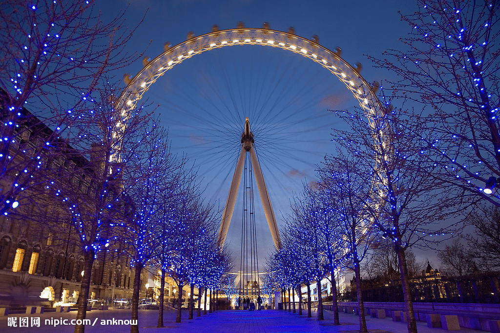 伦敦眼:紧挨着郡政府大厅,是伦敦另一个最现代的地标性建筑。它是世界上最大的摩天轮,30分钟车程一次可载800名乘客。从450英尺的最高点出发,可以看到25英里的景色。
