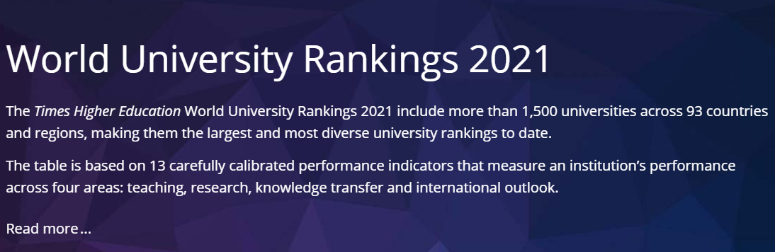 泰晤士高等教育排名(Times Higher Education)是世界大学排名中最权威的三大排名之一。与看重雇主的QS排名、和只看学术的ARWU排名相比,泰晤士高等教育排名(THE)更能体现一所大学在国际上的学术声誉。2021年的排名共包括93个国家和地区的1500多所大学,是有史以来规模最大、最多元化的世界大学排名。