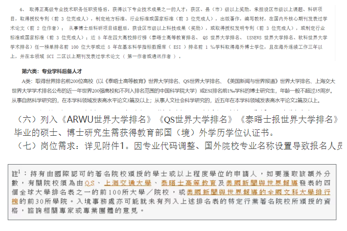 目前国内有很多地方政府、用人单位作为人才引进的标准。其中就有2019年杭州市高层次人才分类、常州大学2020年人才引进类别提到海外博士的部分中写到,要求海外博士毕业于世界排名前200名的高校,排名参考标准中有泰晤士排名。成都市新都区2020年特许人才引进公告中,对留学生的学历要求中有参考泰晤士排名的前100名。香港“优秀人才引进”计划,如果学士或以上程度的学位是由国际认可的著名院校颁授,可额外获得30分。著名院校的判断标准中有泰晤士高等教育世界大学排名