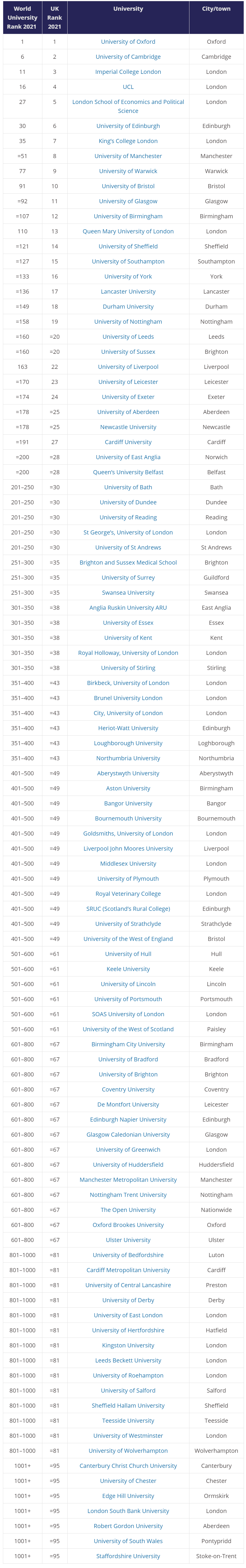 2021年泰晤士世界大学排名中英国大学的表现: