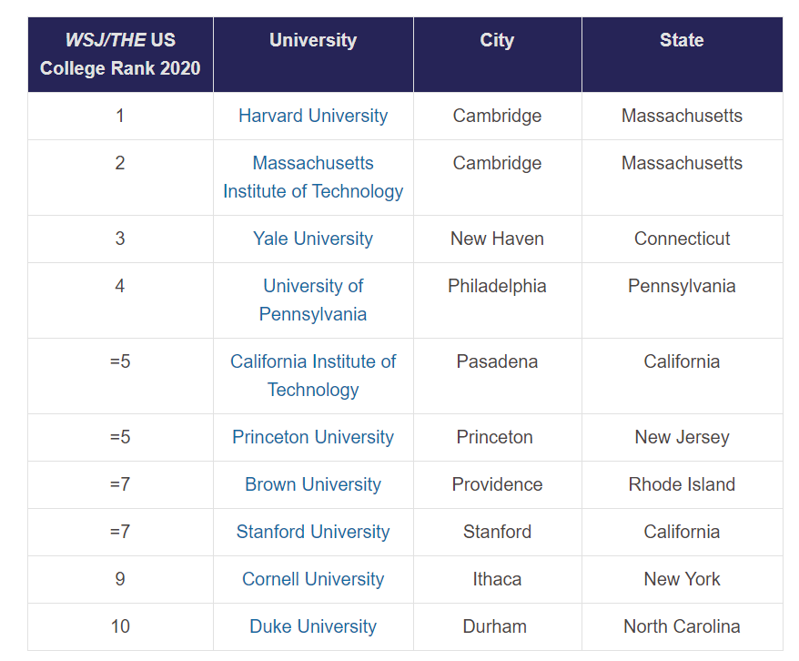 斯坦福、哈佛、加州理工、麻省理工分别位列第2、3、4、5;加州伯克利、耶鲁大学、普利斯顿、芝加哥分别位列第7、8、9、10。