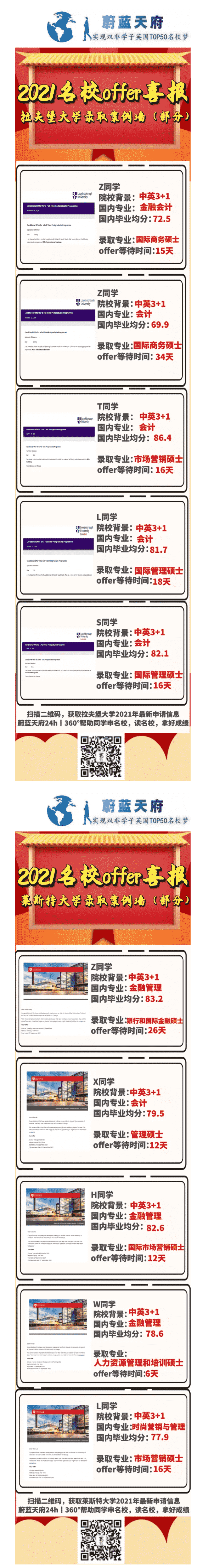 进入2020年11月我们同学迎来了2021年的第二期offer雨啦,下这一期offer雨的大学有卡迪夫大学、萨里大学、思克莱德大学、莱斯特大学,拉夫堡大学等等。期待后面还有更多海外大学offer光顾我们的同学,11月的海外大学请对我们同学好点哦!下面我们就来看看2021名校offer喜报-拉夫堡、莱斯特大学周报的部分申请战绩吧!