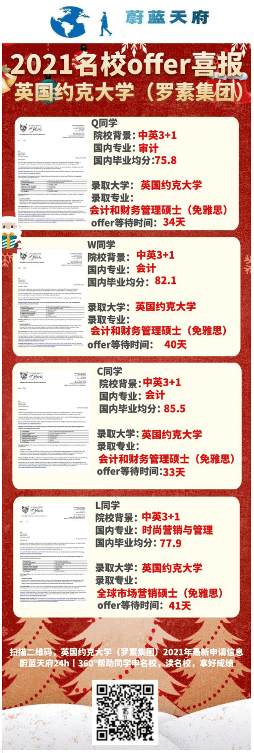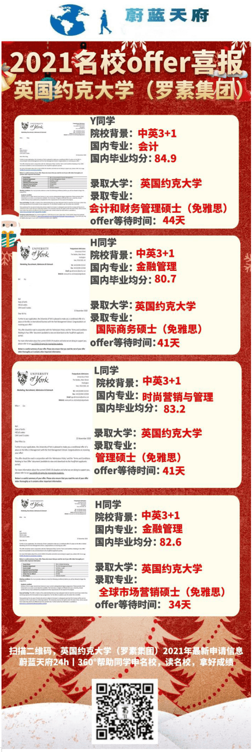进入2020年11月我们同学迎来了2021年的第四期offer雨啦,下这一期offer雨的专场大学是来自罗素集团的英国约克大学。期待后面还有更多海外大学offer光顾我们的同学,12月的海外大学请对我们同学好点哦!下面我们就来看看2021名校offer周报的部分申请战绩吧!