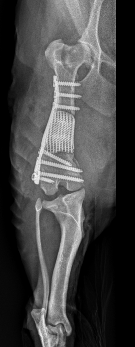当西摩从皮肤和牙齿疾病中恢复过来的时候,麦基博士和她的团队进行了先进的外科手术来安装植入物。她说:“为了鼓励骨骼生长到晶格中,从西摩的肩膀上切下了一块骨移植。“这是混合了犬脱钙骨和西摩自己富含血小板的血浆,然后压入骨板的晶格然后将骨格和钢板放入西摩左股骨骨缺损处,并固定到位。”