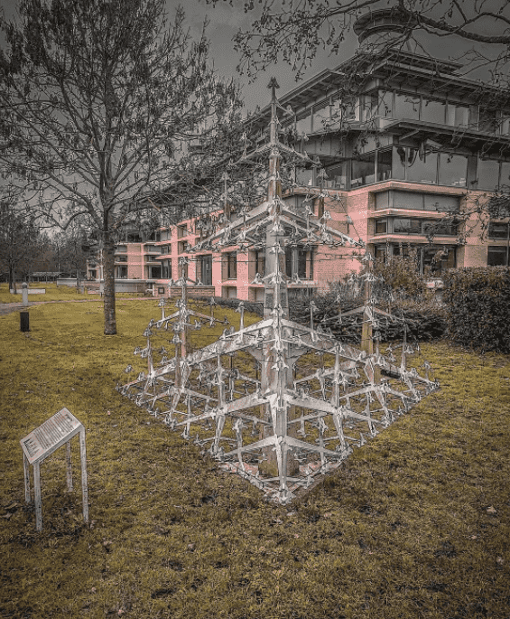 这么一乍看,是不是有点像被一个孩子在试图把灯打开时把它折断了。这其实是“ Sierpinski 树” ,是基于几何学的“分形”建造的——是波兰数学家 Waclaw Sierpinski 设计的几何图形,他在20世纪早期在分形领域做了开创性的工作。 (分形是一种几何图形,其中每个部分具有与整体相同的统计特性)