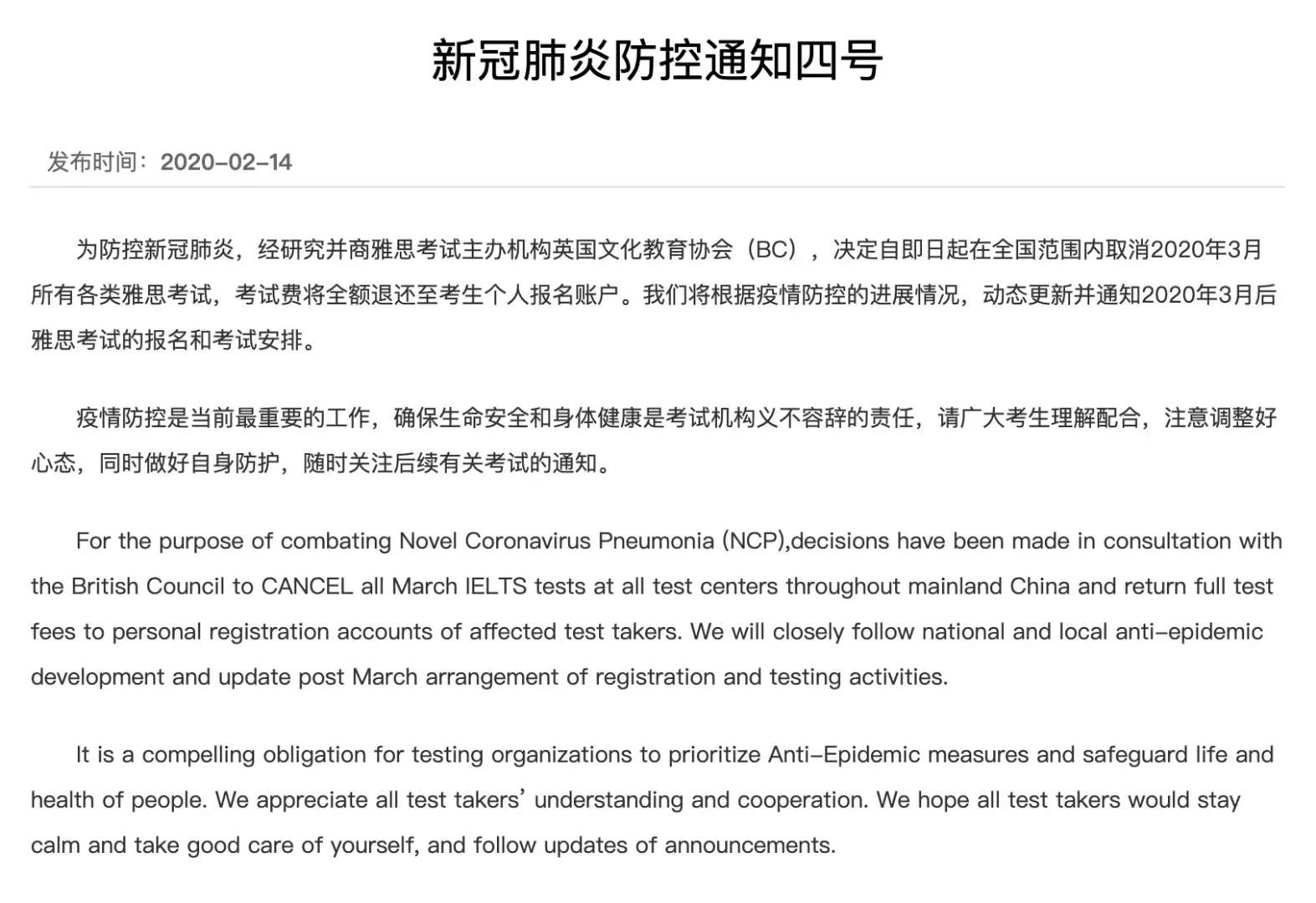 1834 2020-02-14为防控新冠肺炎,经研究并商雅思考试主办机构英国文化教育协会(BC),决定自即日起在全国范围内取消2020年3月所有各类雅思考试,考试费将全额退还至考生个人报名账户。同时将根据疫情防控的进展情况,动态更新并通知2020年3月后雅思考试的报名和考试安排。